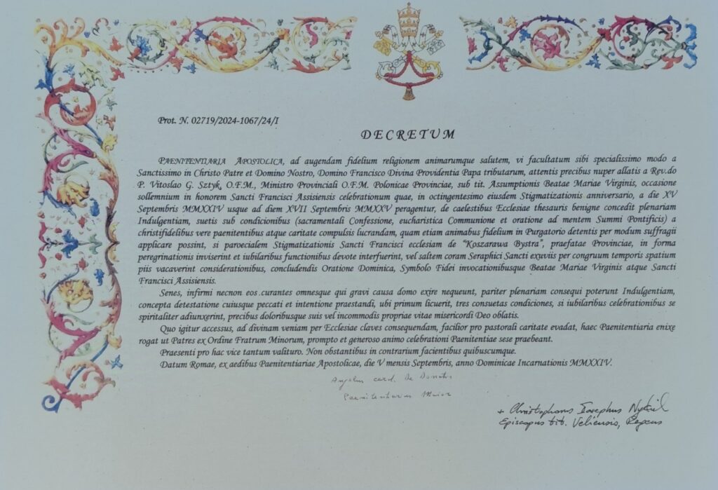 w Chrystusie Ojca i Pana naszego Franciszka z Bożej Opatrzności Papieża, na niedawno przekazaną prośbę przez przewielebnego ojca Witosława J. Sztyka OFM, Ministra Prowincjalnego Zakonu Braci Mniejszych polskiej prowincji pod wezwaniem Wniebowzięcia Najświętszej Maryi Panny, z okazji uroczystych obchodów ku czci Świętego Franciszka w rocznicę ośmiuset lat jego Stygmatyzacji, obchodzone od 15 września 2024 r. do 17 września 2025 r., z niebieskiego skarbca Kościoła udziela łaskawie odpustu zupełnego pod zwykłymi warunkami (sakramentalna spowiedź, komunia eucharystyczna, modlitwa na intencje Ojca Świętego) dla pożytku wszystkich wiernych prawdziwie pokutujących i pobudzonych chrześcijańską miłością, którzy mogą również ofiarować go za dusze wiernych zmarłych w czyśćcu cierpiących jeśli kościół parafialny Stygmatów Świętego Franciszka w Koszarawie Bystrej należący do wspomnianej Prowincji nawiedzą jako pielgrzymi i pobożnie będą uczestniczyć w jubileuszowych nabożeństwach, lub przynajmniej przez stosowny czas pobożnie będą rozmyślać przed relikwiami Serafickiego Świętego, kończąc te rozmyślania Modlitwą Pańską, Wyznaniem wiary i wezwaniem Najświętszej Maryi Panny i Świętego Franciszka.